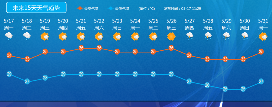 18日阴天,有中雷雨,27到33度;19日多云,局部有雷阵雨,28到35度;20日多云,局部有雷阵雨,29到35度;21日多云,局部有雷阵雨,29到36度。