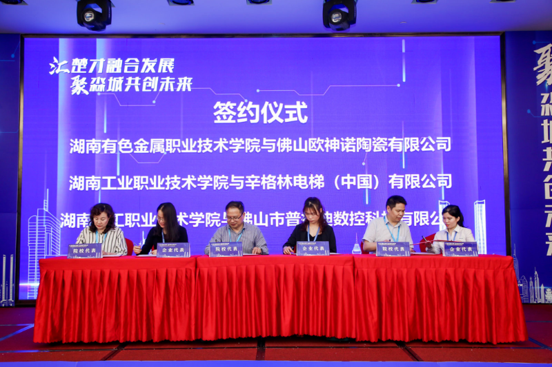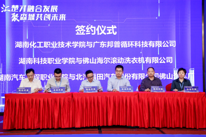 在活动现场,佛山高新区三水园管理局、广东省有色金属学会铝加工专业委员会与湖南有色金属职业技术学院签订三方合作协议;湖南化工职业技术学院与广东邦普循环科技有限公司、湖南化工职业技术学院与广东普拉迪科技股份有限公司、湖南科技职业学院与佛山海尔滚动洗衣机有限公司、湖南汽车工程职业学院与北汽福田汽车股份有限公司佛山汽车厂、湖南有色金属职业技术学院与佛山欧神诺陶瓷有限公司、湖南工业职业技术学院与辛格林电梯(中国)有限公司分别签订校企合作协议,成功与湖南各高校建立合作关系。充分展现了校企合作成果,也为其它校企开展校企合作带来了示范带动效应。