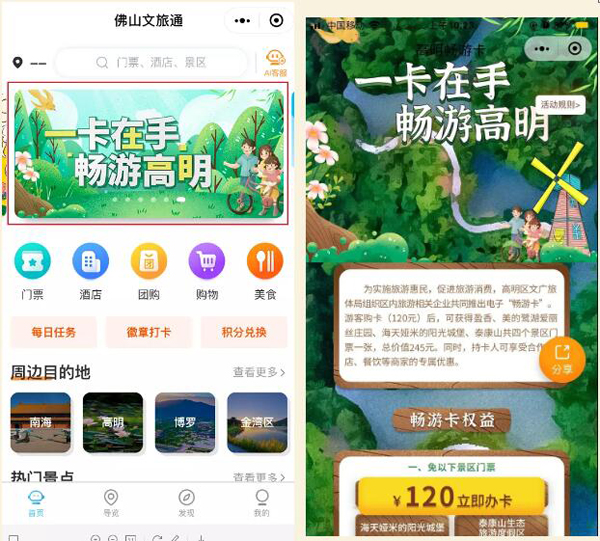 高明区文广旅体局将于5月19日上午10点在区文化中心举办“畅游高明”欢乐季启动仪式。高明区文广旅体育局将会在活动上正式发布策划已久的电子旅游消费卡—“高明畅游卡”,仅需120元即可办理价值245元的高明畅游卡,不仅包含广东盈香生态园、美的鹭湖森林度假区(爱丽丝庄园)、海天娅米的阳光城堡和泰康山生态旅游度假区共四个景区的门票,凭卡还可享受酒店、民宿、美食餐饮等18个合作商家的特别优惠政策,折扣8.5~9折,有效期至2022年5月30日。