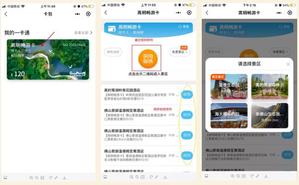 购买成功后,在“一机旅游”小程序【我的】-【卡包】找到“高明畅游卡”。