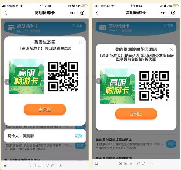 到达景区后,打开相应景区或商家的二维码供工作人员验证即可免费进园。