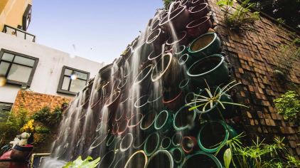 大缸瀑布是由365个颜色各异的大缸组合而成,象征着365天每天都红红火火,盆满钵满。这些大缸都是由南风古灶烧制而成的,中间有一个聚宝盆。在这里,意味着福满。