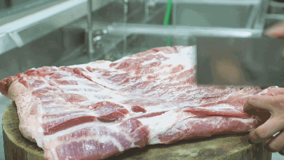 烧肉要好吃,选料很讲究。大厨介绍,靠近肋排的五花肉,肥肉部分相对紧实,肥瘦分层均匀,是制作烧肉的最佳选择。
