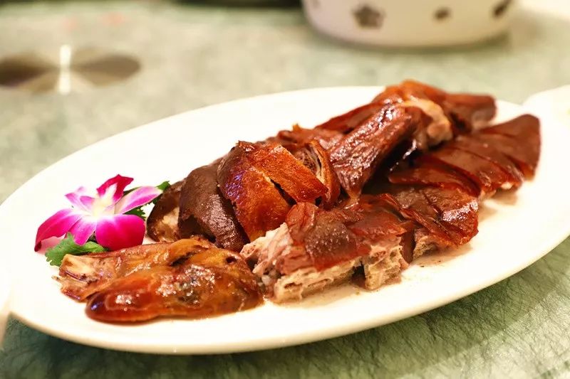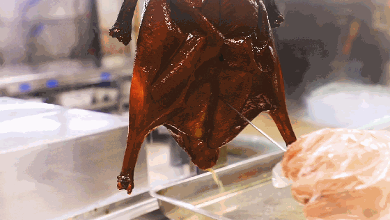 一只7斤半-8斤的鹅,在经历过吹气、涂料、烫皮、过水、烤制等一系列工序之后,最后呈现在我们眼前的就是这只油润光亮,皮酥多汁的烧鹅。