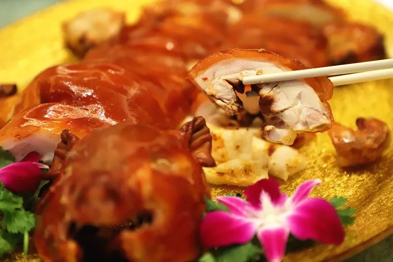 烧味拼盘少不得一口脆皮乳猪。焦糖色皮色的乳猪油亮油亮的,在暖黄的灯光下显得非常诱人。