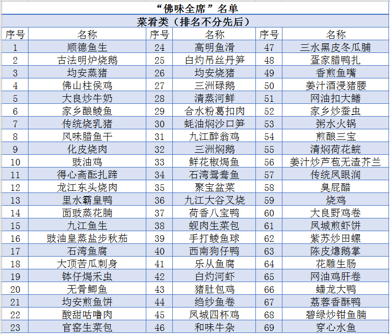 “佛味全席”品牌是由中国烹饪协会和佛山市文化广电旅游体育局联合打造的。经过层层筛选挖掘,选出108道最具佛山味道的菜品,包括69道菜肴、9道汤羹和30道点心小吃。