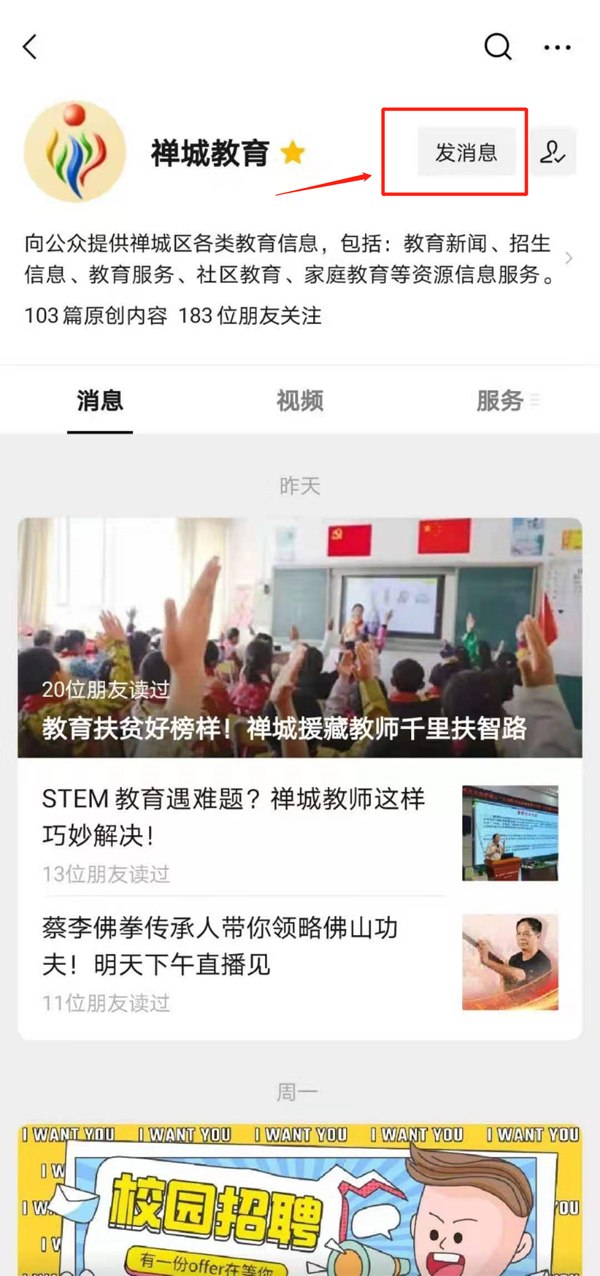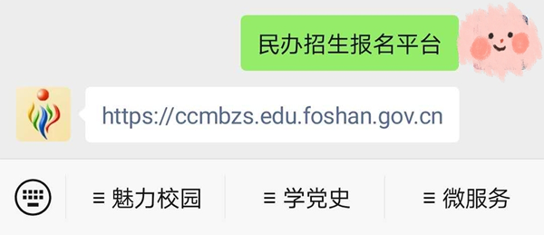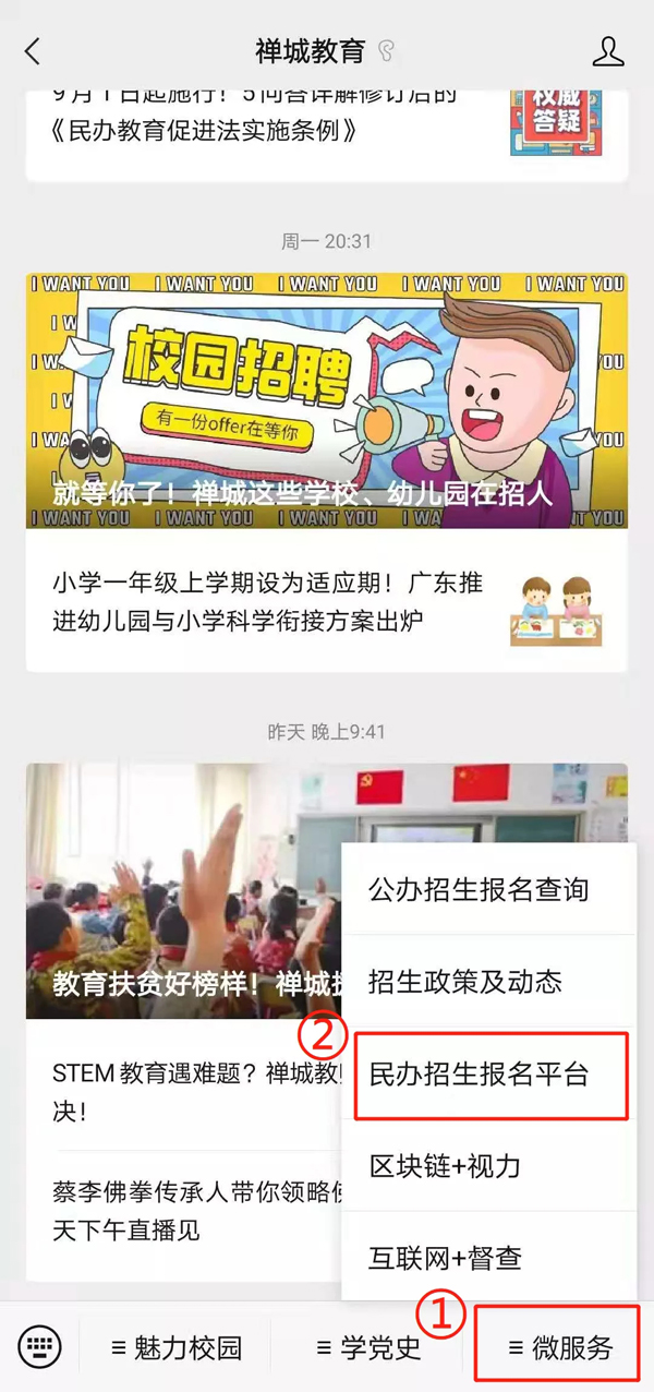 关注“禅城教育”微信公众号,点击子菜单栏“微服务”→点击“民办招生报名平台”即可进入(直接回复“民办招生报名平台”,点击网址也可进入哦)。