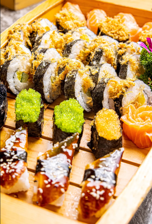 手握鳗鱼寿司、三色蟹籽寿司、加州卷…