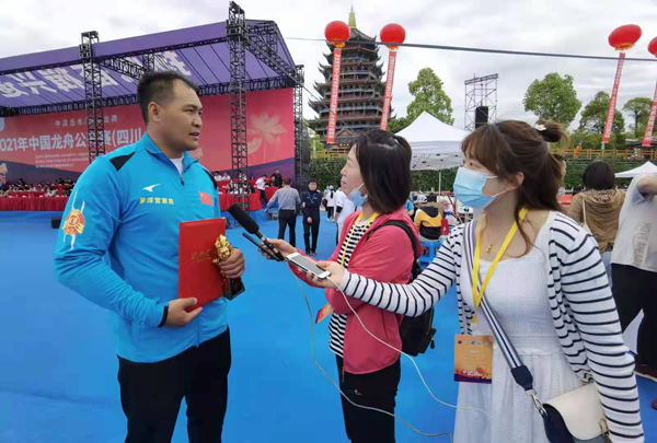 顺德乐从罗浮宫龙舟队教练冯国敬接受媒体采访。
