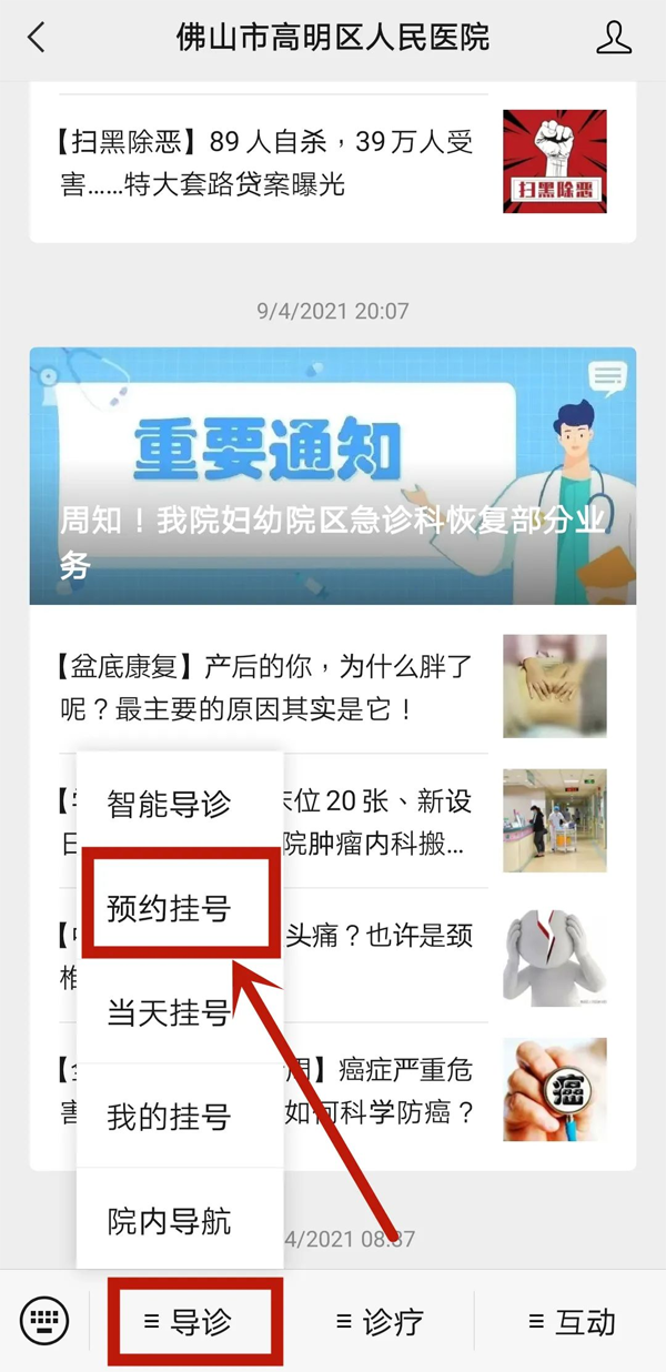 登录高明区人民医院微信公众号-导诊-预约挂号