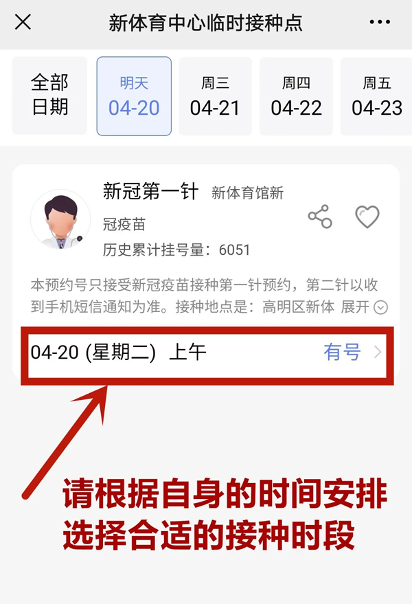 高明体育中心临时接种点仅开放微信预约,请按照微信预约的时间段前往接种;有预约号才能接种疫苗,来到现场凭预约号排队;没有预约,不能现场排队,请没有预约的群众不要前往。预约挂号可以挂明天的号,当天挂号才能挂当天的号。