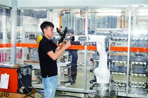 库卡机器人(广东)有限公司工作人员在生产线上作业。/佛山日报记者吕润致摄