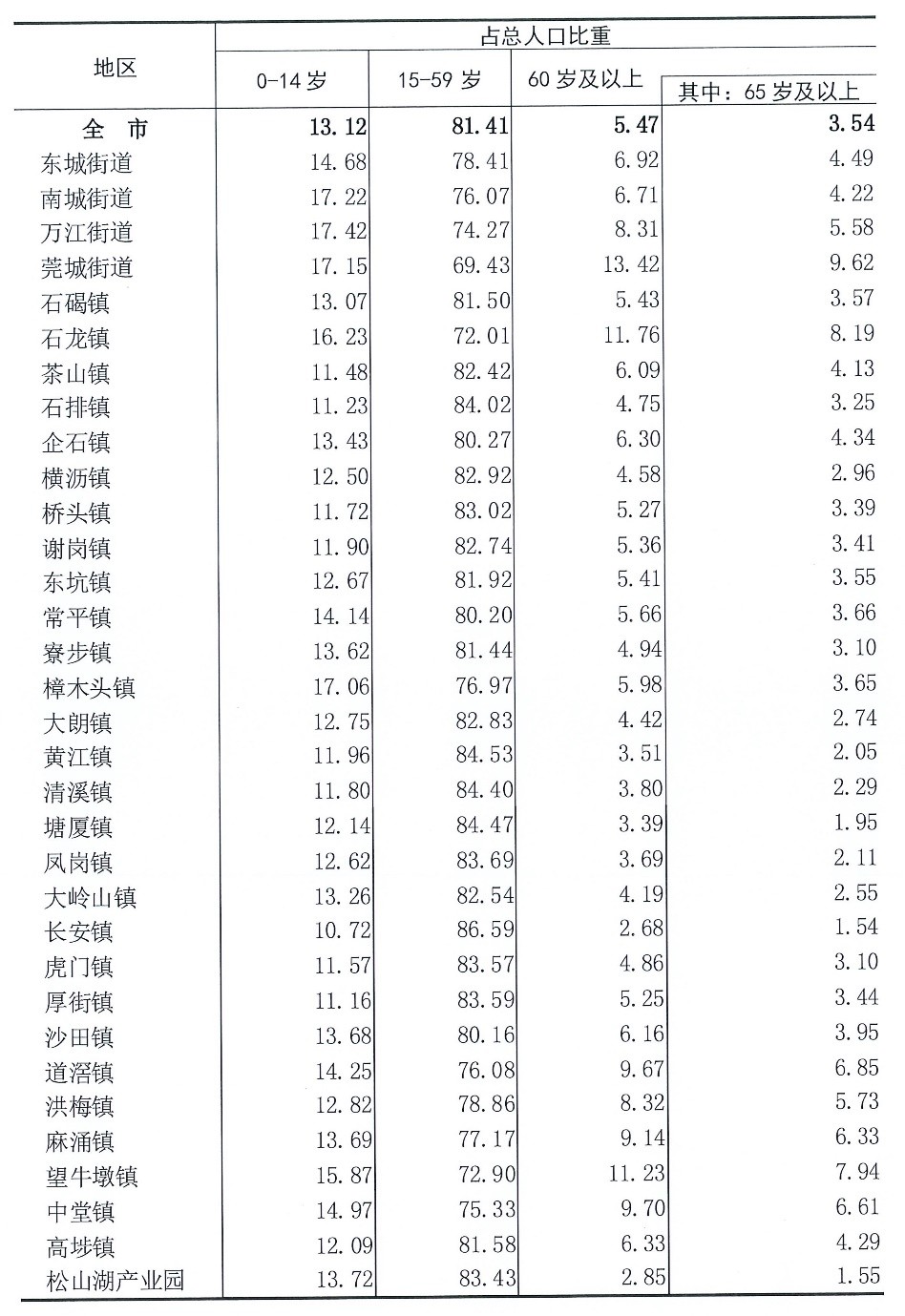 东莞32个镇街里有22个15-59岁人口占比超过80%,并且绝大部份镇街60岁以上人口占比低于10%。