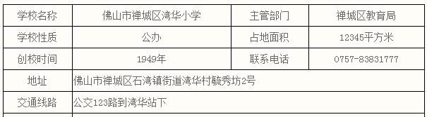 在东平河畔,有一所质朴、蓬勃的学校――湾华小学。2004年评为禅城区一级学校,是禅城区的规范化学校。湾华学校占地面积16亩,建筑面积2720平方米,,具有200米标准环型跑道和100米直跑道的运动场,标准的篮球场。整个校园分为教学区、运动区、生活区三大部分。教学设备比较完善,校园绿树成荫,环境优雅,是一所花园式的学校。现有9个教学班,学生364人,在编教师20人。教师学历全部达标,其中高级教师1人,一级教师18人,不少青年教师成为镇街道和学校的教学骨干。近几年,学校以先进的办学理念和办学目标,科学的管理方法,求真务实的工作作风,不断强化学校的办学优势,取得了突出的成效,学校的办学水平稳步提高,特色亮点初步彰显。