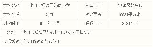 郊边小学位于佛山市禅城区郊边村,是一所创办于1965年的原村办学校。学校现有占地面积6687平方米,生均占地23平方米,建筑面积2125平方米,生均建筑面积8平方米。学校功能场室基本齐全,有篮球场和150米环形跑道田径场,生均藏书量达27本。校园布局合理,教学区和运动区相对独立,绿树成荫,环境优雅、整洁,文化气息浓厚。学校积淀了“树人教育”特色,以“乐育天下,精心树人”为办学宗旨,走“特色引领、全面发展”之路,致力打造城乡结合教育的优质品牌,努力实现师生整体素质的和谐发展,让阳光人生从这里起步。学校1999年被评定为区一级学校;2006年被评定为佛山市绿色学校,区教育系统先进单位;2007年被市教育工会评为佛山市师德建设先进集体;2007年被区教育局、体育局授予“武术、龙狮教学特色试点学校”; 2008年被评广东省义务教育规范化学校;2010年被祖庙街道选定为武术训练基地。2018年被禅城区教育局选定为“佛山市禅城区学校少年宫”。