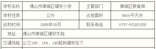 镇安小学位于佛山市禅城区镇安村,是一所创办于1968年的全日制公办小学。占地6800平方米,建筑面积3820平方米,现有12个教学班,学生533人。学校功能场室基本齐全,有图书室阅览室、仪器室、科学室、电脑室、美术室、音乐室、心理咨询室、卫生保健室、体育器材室、会议资料室、多媒体室、心理团体辅导室、少先队队部室等辅助教学的功能场室,教育教学设施完备,能基本满足教育教学需求。有人造草足球场,塑胶篮球场、150米环形跑道和田径场。