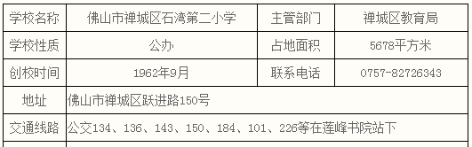 佛山市禅城区石湾第二小学是佛山市一级学校、佛山市规范化学校,坐落在佛山市禅城区石湾镇街道跃进路150号。学校创办于1962年,于2004年通过佛山市一级学校评估,于2007年8月由原石湾二小和原石湾四小合并两校区办学(取名为佛山市禅城区石湾第二小学),于2014年9月调整为一校区办学。学校在多年的办学过程中,经历了“重建校舍,促进发展;两校办学,合并发展;一校办学,优质发展”的过程。