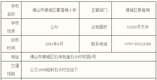 霍藻棉小学位于禅城区美丽的东平河畔,原名石头小学,创办于1951年。1990年由旅港同胞霍藻棉先生的后人及各界爱心人士捐资兴建新校舍,于1991年3月落成,更名为霍藻棉小学。学校占地面积13320平方米,建筑面积9046平方米。校园绿树成荫、环境优美。教育设施设备较齐全,学生运动场地充足,拥有200米环形炉渣跑道,1800㎡天然草皮足球场,580㎡水泥篮球场,350㎡室内活动场,以及绿荫广场、中心花园室外活动场所。2016年,在村委会的支持下,将市场A座二楼3000平方的场地无偿提供给学校使用,学校用150万元进行改造,增加了17间功能场室。现学校共有场室45间,其中普通教室16间,各专用场室29间,场室内配置了多媒体、实物投影等教学设备,基本能满足学校教育教学需要。
