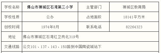 佛山市禅城区石湾第三小学坐落在风景美丽的石湾公园旁,毗邻佛山市软件产业园、1056创意产业园、陶师庙等历史人文古迹。学校环境优美,绿树成荫,典雅别致,处处彰显着“自然生态”,“生命成长”的不同内涵,同学们都说是“公园里的学校”。石湾三小前身是兴无小学和水上运输小学,是厂矿、水上运输等企业开办的职工子弟学校,经历了“并校重建、变更学制、并校易名、扩建发展”的非常办学历史,1974年合并为石湾镇第三小学,1991年由石湾镇政府投资在原址重建,占地面积18141平方米,绿化覆盖率66.5 %。现有200米标准运动场一个, 34个功能室,配备了多媒体电教室、科学实验室、图书室、心理辅导室、梦想课室等多种功能室,实现了“班班通”,达到《广东省小学教育装备标准(试行)》一类标准。现有24个教学班,在校学生1082人,教师58人,其中小学高级教师48人,本科毕业44人,教师学历达标率100 %。禅城区名师1人,区教坛新秀4人,区兼职教研员3人,区级以上骨干教师31人。
