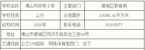 佛山市铁军小学是广东省一级学校,其前身是“五四”进步青年郭鉴冰等人于1920年创办的季华两等女子学校。1921年中国近代民主革命家廖仲恺先生等12位知名人士发起募捐筹建新校——季华小学。1958年,季华小学与佛山市第二小学合并,沿用佛山市第二小学校名,被定为广东省重点小学。1991年7月1日,为纪念革命烈士陈铁军,佛山市人民政府决定更佛山市第二小学为佛山市铁军小学,由著名作家魏巍题写校名。历经了90多年的办学历程,学校底蕴深厚、文化厚重,先后培养了民族英雄陈铁军、工程院院士陆启铿、外交参赞黄家骙等知名人士。