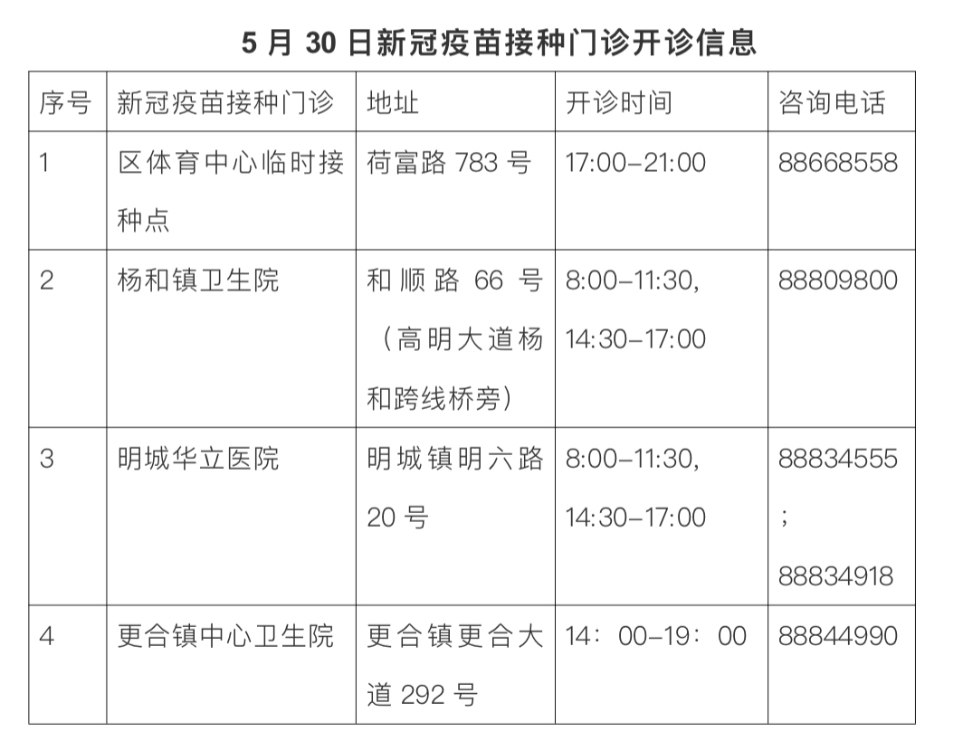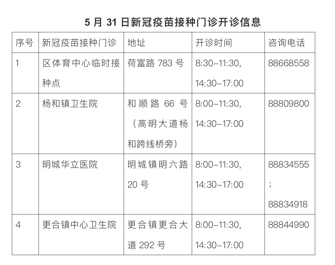 根据工作安排,5月30日、31日区内新冠疫苗接种门诊开诊信息如下。请市民先到“户籍所在地或者居住地的村(居)委会”预约并领取凭证,然后持“预约凭证”以及“身份证原件”前往接种门诊进行接种。