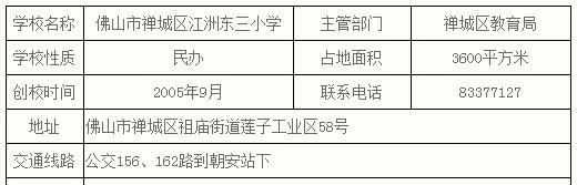 佛山市禅城区江洲东三小学,位于佛山市禅城区祖庙街道莲子工业区58号,原是禅城区环市镇公办小学,于1990年重建,重建了一座四层12间教室的教学楼,和一座5间教室的一层平房,占地面积为3600平方米。为了教育事业得到发展,东三小学于2004年转制为民办小学,以外来工子女为生源。“严谨、诚信、求实、进取”是我校校风,“办好学校,回报社会”是我校办学宗旨;“让政府放心,社会认可,家长满意,教师乐教,学生乐学”是我校的办学目标;以“促进教师队伍,紧抓教学质量,培养学生的良好行为习惯为我校特色”是我校的发展规划。