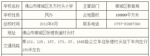 东方村头小学是一所广东省义务教育规范化学校。优质东方教育集团于2009年7月,在原村头小学的基础上承办的一所全日制民办小学。学校占地面积10999平方米,建筑面积8291平方米,校园布局合理,绿树成荫,环境优雅,文化气息浓厚。