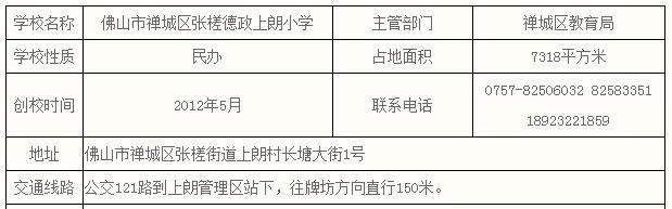 佛山市禅城区张槎德政上朗小学是一所由广东省德政教育集团创办的六年制小学,位于禅城区张槎街道上朗村。学校自2012年创办以来,牢记“崇德、立志、自强、创新”的上小校训,发扬”守礼、勤俭、乐学、友善”的上小精神,齐心协力,以“德行教育,阳光上小”为办学理念,规范学校办学行为,进行精细化管理,深入进行德行教育课题研究。学校先后被评为广东省义务教育规范化学校,广东省义务教育标准化学校,广东省无烟单位,佛山市绿色学校,佛山市德育达标学校,是广东省民办教育协会理事长单位,禅城区民办教育协会会长单位。