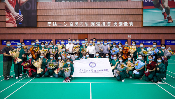 在岭南明珠体育馆,郭文海送别支援佛山开展核酸检测工作的广州医护人员,并与他们合影。/佛山日报记者吕润致摄