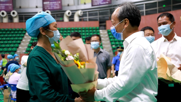 “谢谢了!谢谢你们!”郭文海向医护人员送上鲜花,感谢他们这几天为佛山防疫工作付出的辛勤劳动和汗水。