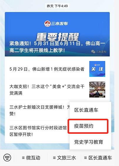 关注“三水发布”微信公众号,点击底部菜单栏“疫苗预约”,进入佛山市移动健康综合服务平台申领电子健康码,申领后点击中间图片的新冠疫苗预约接种入口,点击进去即可预约。