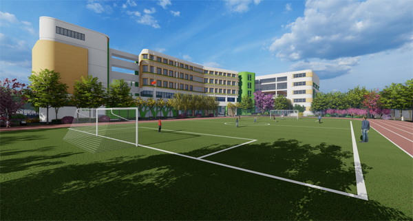 室外设施布局方面,学校教学楼西面是足球场、200米环形跑道及60米直行跑道、篮球场、沙池以及儿童乐园等室外活动场地。园林景观设计与学校植物园科普课程相结合,设置生态区、科普区、专类区、实验探究区。