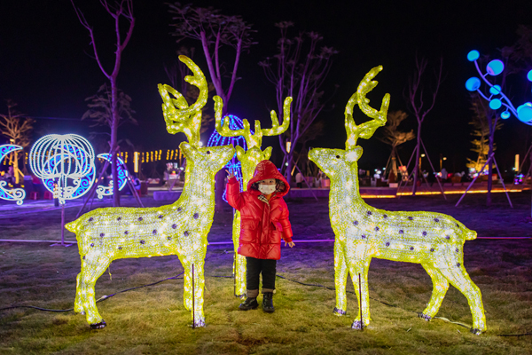 乐平同心湖广场上市民们在灯光雕塑前拍照留念。/佛山日报记者王澍摄