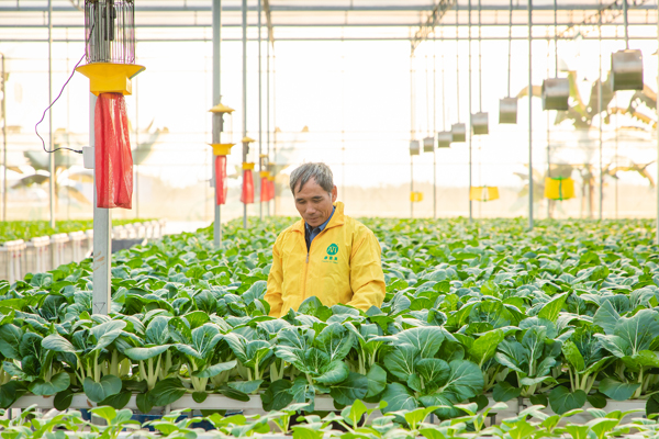 佛山三水“百里芳华之西江十里画廊美丽乡村”精品线路上的白坭镇康喜莱现代农业产业观光园区,园区内工作人员正在打理无土化栽培的小白菜。/佛山日报记者王澍摄