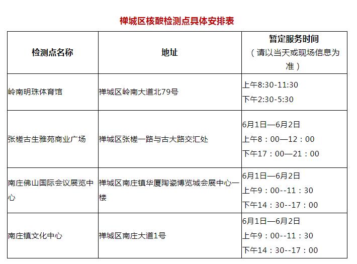 禅城区全员核酸检测工作已基本结束,为确保“不漏一户、不漏一人”,区内将保留岭南明珠体育馆、张槎古生雅苑商业广场、南庄佛山国际会议展览中心、南庄文化中心等4个检测点,继续为本辖区常住人员提供检测服务,各检测点见附表。为避免人群扎堆,减少人员流动,具有本辖区户籍或本辖区居住证的居民,通过扫码在线预约登记,预约成功后,携带有效身份证明前往采样点进行检测。