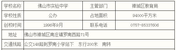 佛山市实验中学创办于1996年,位于中国陶瓷商贸之都禅城区南庄镇,原名南海市南庄镇高级中学,2003年3月,因行政区划调整,学校划归禅城区,2008年1月1日学校正式成为禅城区直属高中。学校2010年9月开始承办内地西藏高中班,2012年11月2日学校正式更名为“佛山市实验中学”。2014年7月,以佛山市实验中学为龙头,吉利中学、罗南小学、吉利小学、醒群小学、龙津小学、杏头小学、梧村小学8所学校共同成立了“佛山市实验中学教育联盟”。