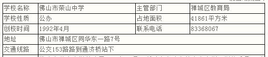 佛山市荣山中学始建于1992年,是一所以高中为主的完全中学。学校秉承“以德启智,多元发展”的办学理念,2017年1月被授予“广东省国家级示范性普通高中”光荣称号。2017年2月被评为“广东省依法治校示范校”。2017年12月被认定为广东省基础教育研究实验基地学校。