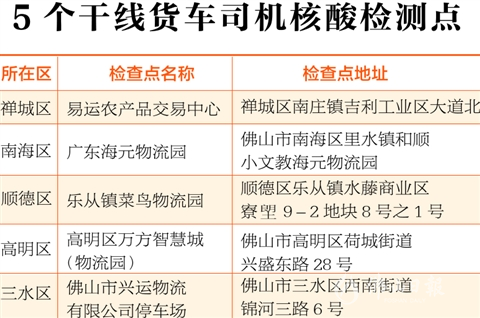 此外,为确保货运车辆正常运行,昨日下午,佛山市新型冠状病毒肺炎疫情防控指挥部办公室交通管控工作专班发布了《关于设立货车司机核酸检测点的通知》,在禅城、南海、顺德、高明、三水全市五区设立5个干线货车司机核酸检测点,从6月2日起,为货车司机提供核酸免费检测服务。
