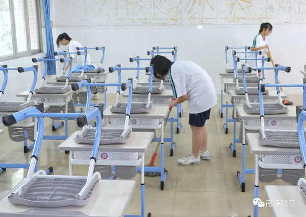 九江中学考点,高一高二学生志愿者正对考场进行布置。