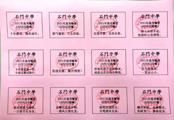 考生们进入了紧张的冲刺阶段,石门中学饭堂用颇具特色的“高考套餐”菜单向考生表达祝福和鼓励。还每天为高三学子特制了餐票、鸡蛋票、汤票和糖水票,学生凭票在饭堂免费领取相应食物。在这些“加料”的票据上,学校还贴心印上了“让结局不留遗憾,让过程更加完美”“十年磨剑为一搏,战场试锋现真我”等令人振奋的鼓励和祝福语句。