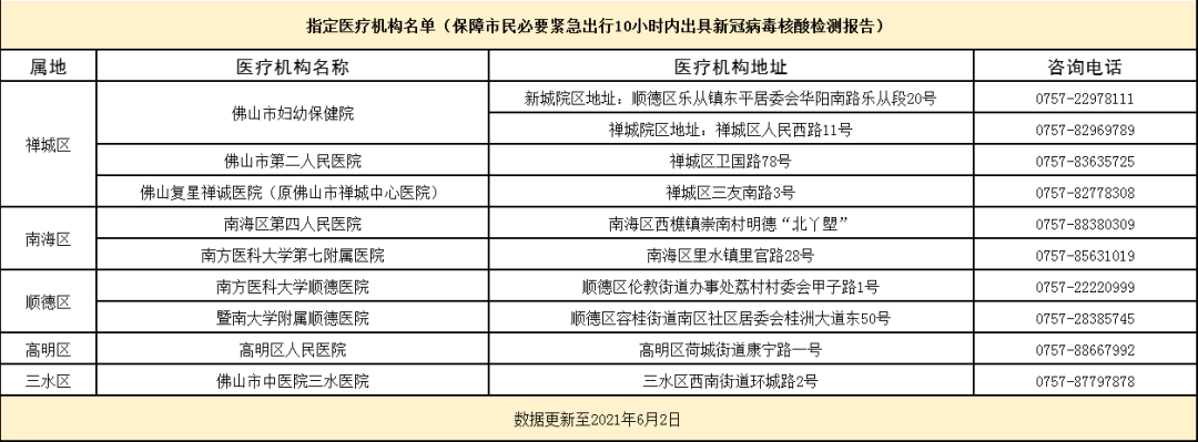 确有需要紧急离开佛山的人员,可在服务时间内到指定医疗机构(名单附后,共9家)提出紧急新冠病毒核酸检测申请并进行检测,医疗机构设立绿色通道,优先安排检测,尽量在10小时内出具核酸检测结果。