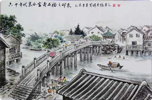 △ 里水画家黄伟英曾把上世纪60年代的富寿旧景记录下来,这幅《里水旧富寿印记》便是那时候的真实场景。在富寿桥的一侧,那些灰白的老房子,便是通津街的商铺。