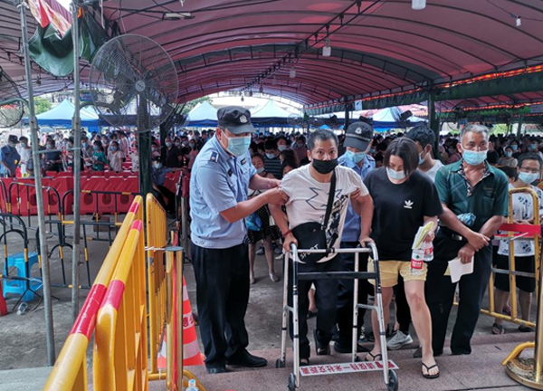 5月31日,夏日炎炎,乐从镇上华村核酸检测点过百名市民排起了长龙,北滘派出所民警佘国华被安排到场协助维持秩序。期间,一位坐着轮椅的残疾老人引起了佘国华的注意,老人吃力地用右腿支撑着整个身子在挪动着轮椅,前面排着一条长龙,佘国华见状马上跑上前帮忙,为了让行动不便的老人家尽快完成核酸检测,他帮助老人申请开辟绿色通道,在他的热心帮助下,老人很快就完成了核酸检测,随后,佘国华又帮助另一名拄着拐杖的老人走绿色通道快速做完核酸检测,两位老人和周围群众纷纷对民警的暖心举动竖起了大拇指。