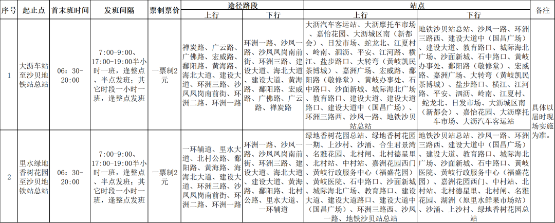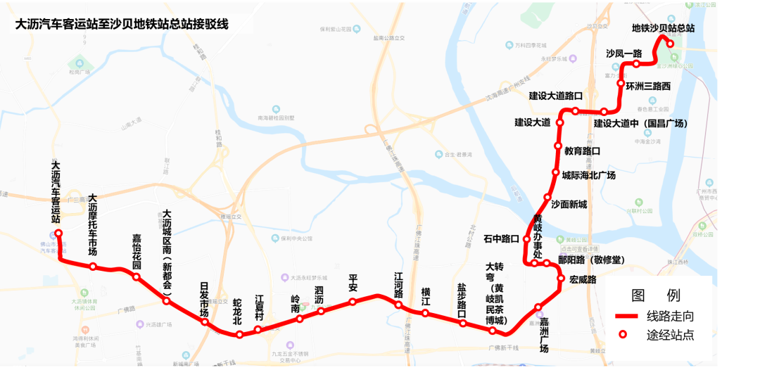 一、新增“大沥汽车站至沙贝地铁站”的临时地铁接驳线路,途经广佛路-宏威路-鄱阳路-黄岐大桥-海北大道-建设大道-环洲三路-沙凤凤岗南前街-环洲二路等道路;沿线设置大沥汽车站、岭南、嘉洲广场、地铁沙贝站总站等站点;运营时间06:30-20:00;高峰半小时一班,逢整点、半点发班,其它时段一小时一班,逢整点发班;