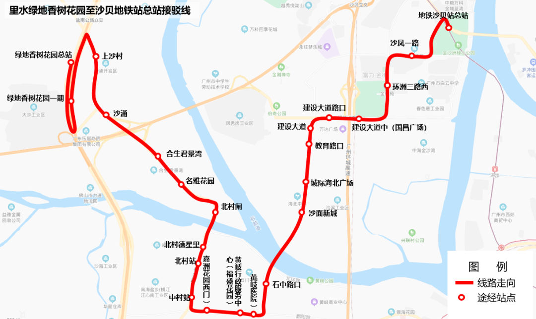 二、新增“绿地香树至沙贝地铁站”的临时地铁接驳线路,线路途经佛一环辅路-里水大道南-北村公路-鄱阳路-黄岐大桥-海北大道-建设大道-环洲三路-沙凤凤岗南前街-环洲二路等道路;沿线设置绿地香树花园总站、沙涌、嘉洲花园西门、地铁沙贝站总站等站点;运营时间06:30-20:00;高峰半小时一班,逢整点、半点发班,其它时段一小时一班,逢整点发班。