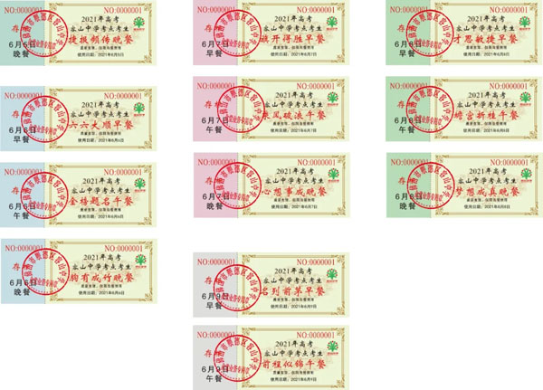 高考前30天,容山中学分批次缩短晚修时间,每次提前15分钟,注意劳逸结合,调整好生物钟,在确保不聚集前提下开展学生活动,学校设计出富有特色的高考餐票,给学生积极的心理暗示,存根交学校,副券做纪念。