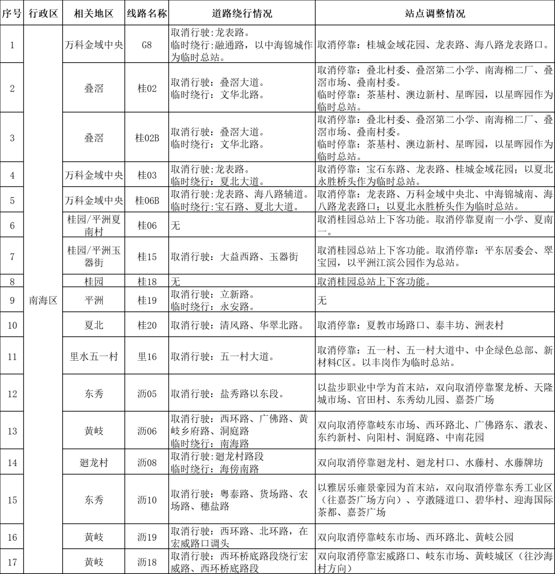 二、南海区部分道路实施交通管制,G8、桂02、桂02B、桂03、桂06B、桂06、桂15、桂18、桂19、桂20、里16、沥05、沥06、沥08、沥10、沥19、沥18等17条公交线路将临时绕行管制路段,相关停靠站点对应有所调整。
