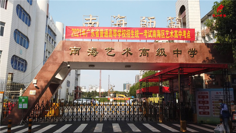 南海艺高考点:为社会考生提供贴心服务 今年,南海区参加2021年普通高考考试有1.6万多名考生,设置普通高考考点15个。设置高三学生学业水平考试考点1个,地点在桂城中学。 6日下午,记者来到南海艺术高中考点,这里也是南海区中心考点。下午4:30,外宿的社会考生在家长的陪伴下来到校门口,出示粤康码和进行体温检测后,凭准考证、身份证进入考点。市民林女士陪孩子到校踩点,高考期间也将陪考全程,她说:“我们事先在附近订了酒店,我本来有点担心明天来考场的路上会不会有突发情况而迟到,但孩子说不用担心,学校附近有交警的铁骑队,遇到紧急情况拨打热线,就可以在交警的帮助下顺利抵达考场。”