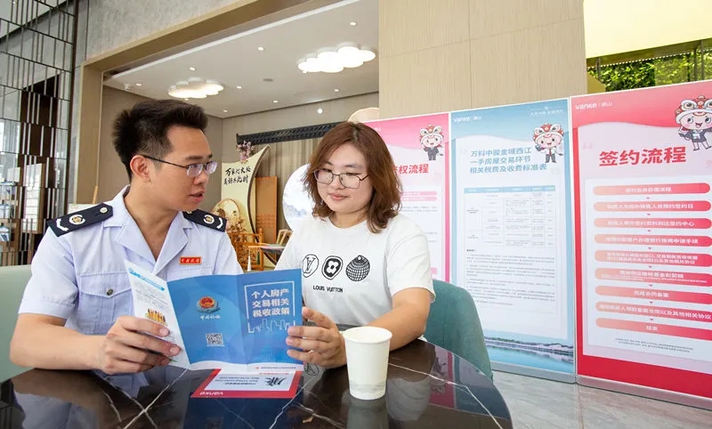 佛山税务部门工作人员为购房者讲解增量房交易涉税政策以及网上申报契税操作。