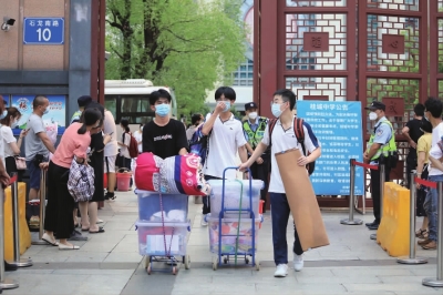 不少考点计划分三个不同的时段组织考生撤离考场。比如南海中学考生完成高考后将有三个撤离时间,分别是中午12时15分、下午3时45分、6时15分,学生什么都不带,考完就直接回家,初定6月10日上午统一返校拿行李。